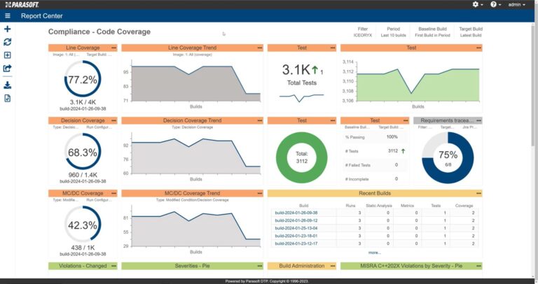 Parasoft DTP’s dynamic, web-based reporting dashboards include compliance reporting, customizable widgets, source code navigation, advanced filtering, and advanced analytics. DTP also completes and automates requirements traceability between test cases in C/C++test, the code, and requirements in ALM tools such as DOORS Next, Polarion, Codebeamer, Jama, and Jira.