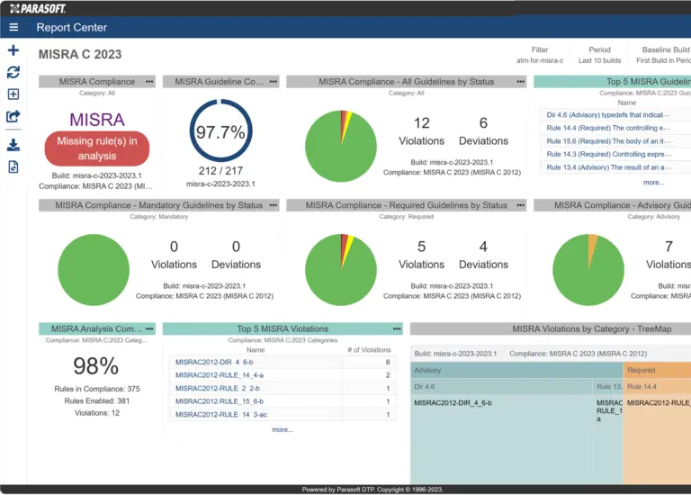 Parasoft’s solution for functional safety and security enables embedded development teams to satisfy the testing and software quality requirements that stem from safety and security compliance standards. This includes comprehensive testing, analysis, and documentation.