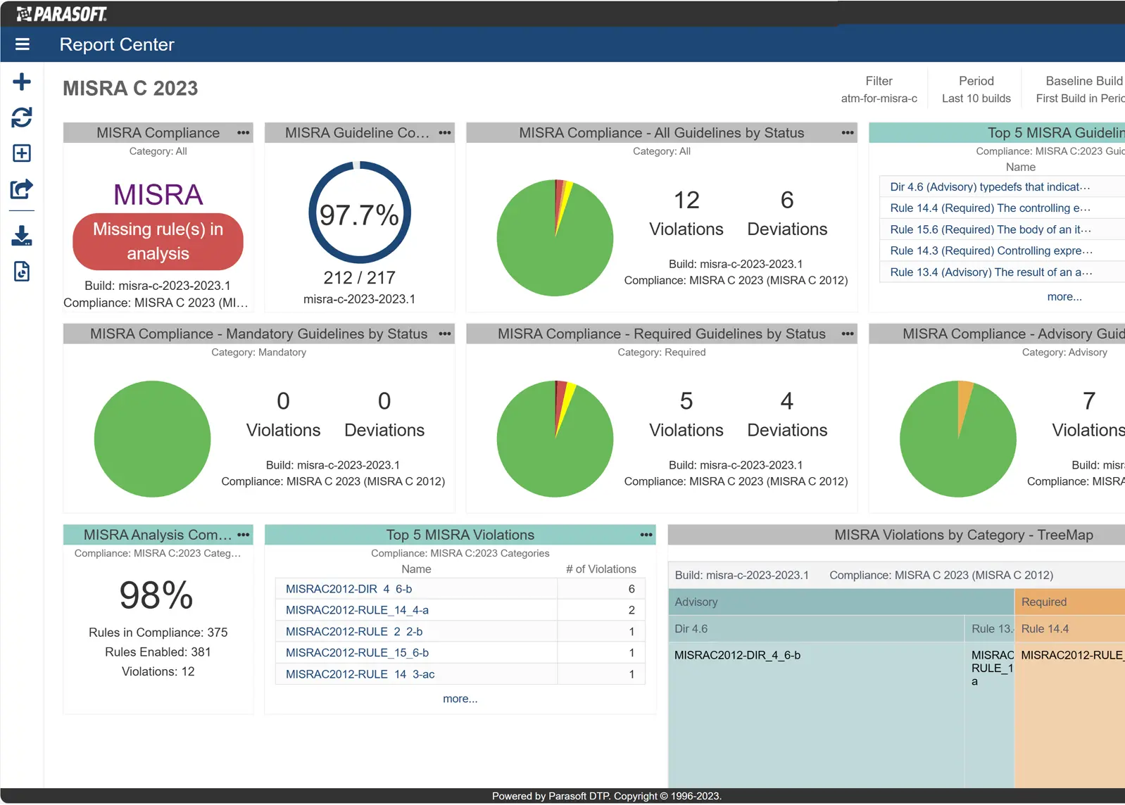 Reporting and analysis provide insights into the progress, quality, and standards compliance of embedded safety and security-critical applications in C and C++. Parasoft DTP performs analysis and autogenerates comprehensive reports for developers to identify trends, patterns, and areas for improvement to enhance the software reliability and robustness.